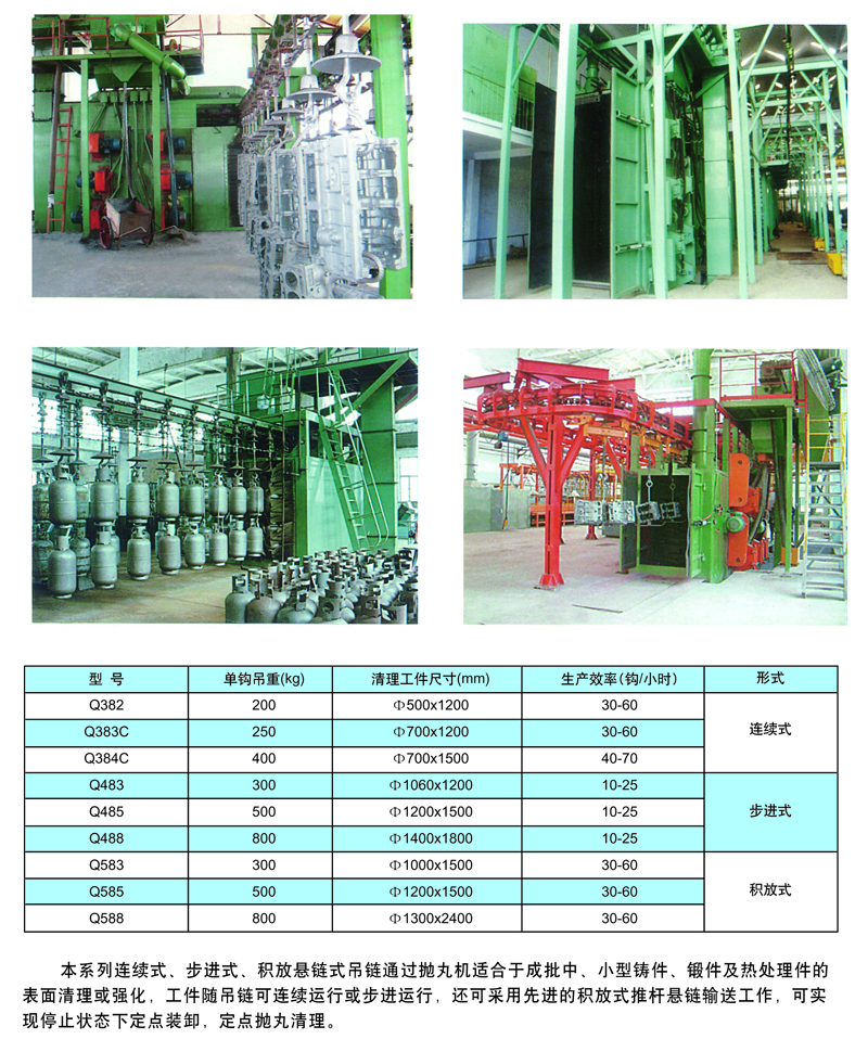 •       本系列连续式、步进式、积放悬链式吊链通过抛丸机适用于成比中、小型铸件、锻件及热处理件的表面清理或强化,工件随吊链可连续运行或步进运行,还可采用先进的积放推杆悬链输送工作,可实现停止状态下定点装卸,定点抛丸清理。