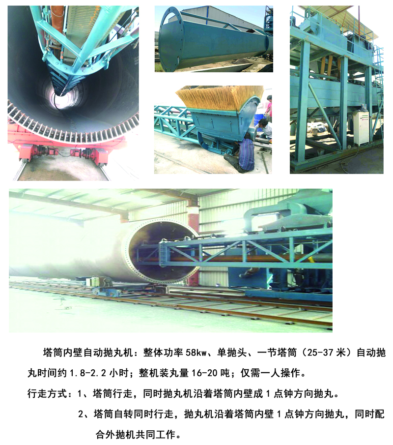 整体功率58KW、单抛头、一节塔筒(25-37米)自动抛丸时间约1.8-2.2小时,整机装丸量16-20吨;仅需一人操作。
