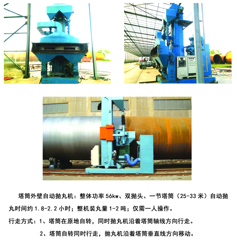 整体功率56KW、双抛头、一节塔筒(25-33米)自动抛丸时间约1.8-2.2小时;整机装丸量1-2吨;仅需一人操作。