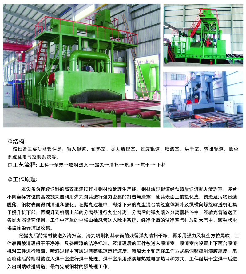 该设备主要功能部件是;输入辊道、预热室、抛丸清理室、过渡辊道、喷漆室、烘干室、输出辊道、除尘系统及电气控制系统等。